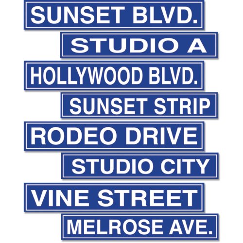 prtd 2 sides wdifferent designs Package includes 4 Hollywood Road Sign Cutouts Rodeo Drive Sunset Blvd Hollywood Blvd and Vine Cutouts measure approximately 4 high x 24 wide and are printed on both sides Material Paper Design is stylish and innovative Satisfaction Ensured Great Gift Idea Read More..