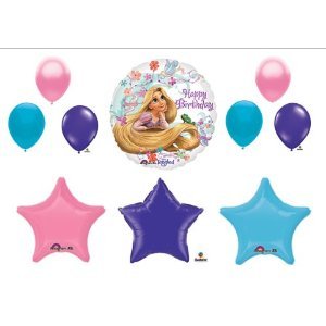 This listing is for a 10-piece Disney Tangled Balloon decorating kit You will receive One 1 18 Tangled Happy Birthday Mylar Balloon Three 3 20 Star Mylar balloons1 purple 1 blue and 1 pinkSix 6 11 Coordinating latex balloons2 Blue 2 pink and 2 purpleAll you do is add He Read More..