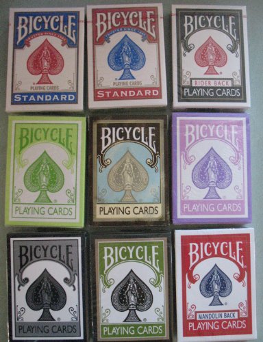 I highly recommendLot 9 Decks Bicycle Playing Cards Blue, Red, Black, Pastel Green, Pink Berry, Pink on Purple Logo Back, Aqua Tan, Rejuvenate, Mandolin Back Red and Silver Reverse